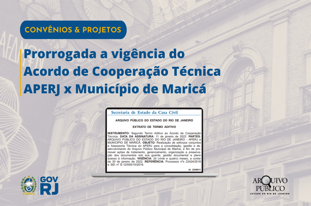 Foi publicado no Diário Oficial do Estado do Rio de Janeiro o termo aditivo que prorroga por mais 24 meses o Acordo de Cooperação Técnica entre Arquivo Público do Estado do Rio de Janeiro e Prefeitura Municipal de Maricá.